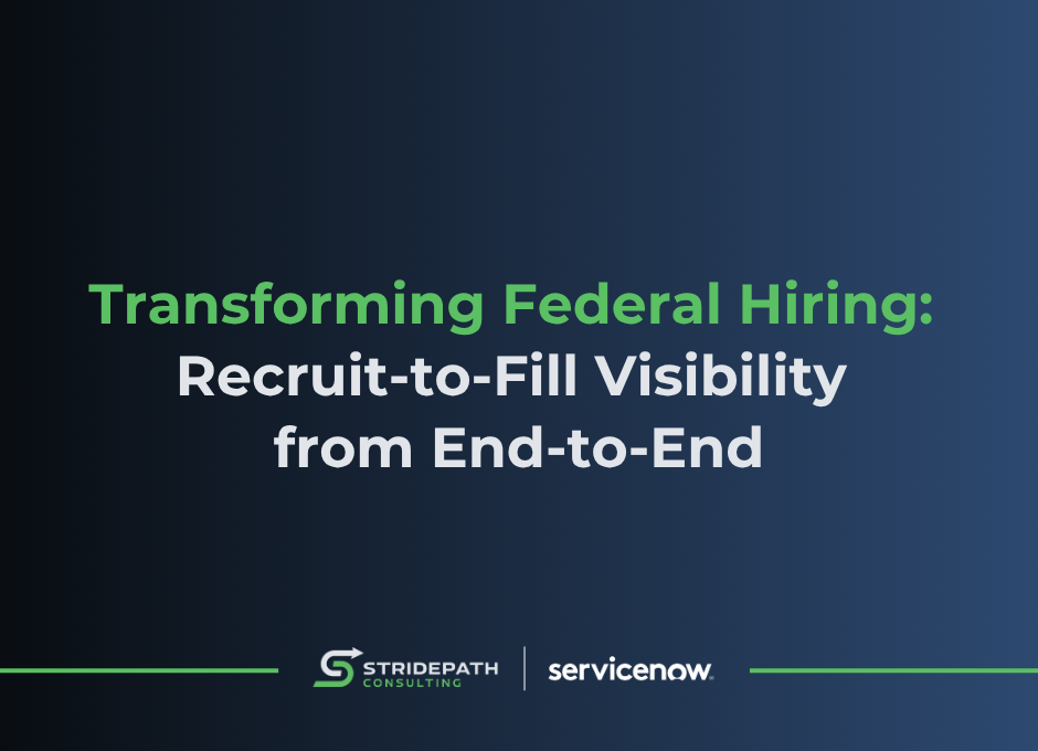 Stridepath’s Recruit-to-Fill (Hiring Core) solution brings structure and visibility to the entire hiring lifecycle. Built on ServiceNow, it works alongside systems like USA Staffing to orchestrate PAR (SF-52) approvals, streamline position management, and provide real-time insight into hiring activity from request through onboarding.